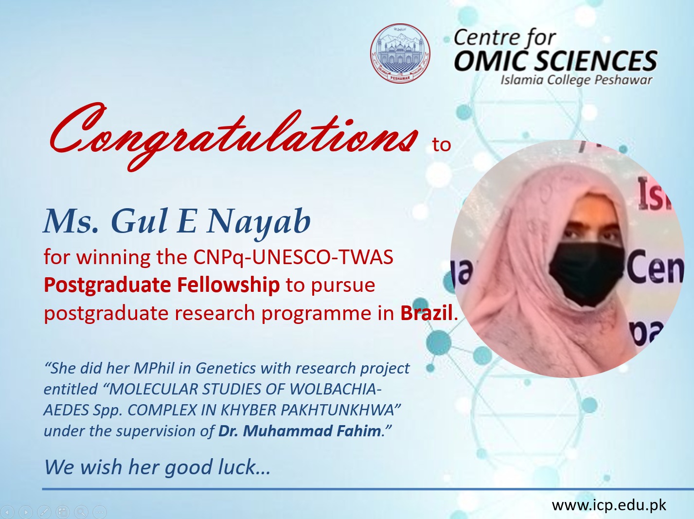 The Centre for Omic Sciences, Islamia College Peshawar, proudly congratulates Ms. Gul E Nayab, a student from its Pioneer Batch, for securing the highly competitive CNPq–UNESCO–TWAS Postgraduate Fellowship to pursue her postgraduate research programme in Brazil.