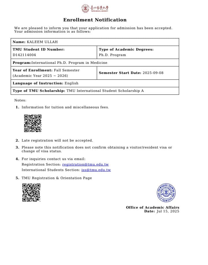 Kaleem Ullah has also been awarded the TMU International Student Scholarship A, a distinguished award that provides full financial support to exceptional international scholars. His doctoral program, taught entirely in English, will begin in the Fall Semester of the 2025–2026 academic year, starting September 8, 2025.