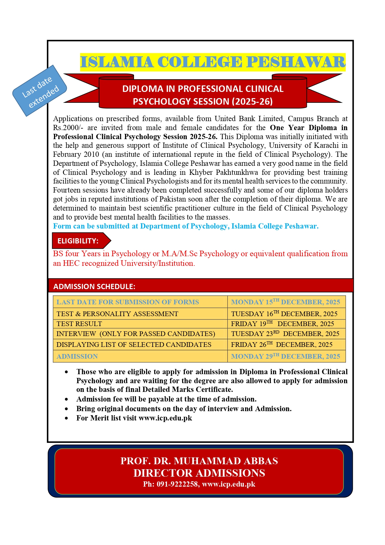 admission open in Professional Clinical Psychology Session 2025-26