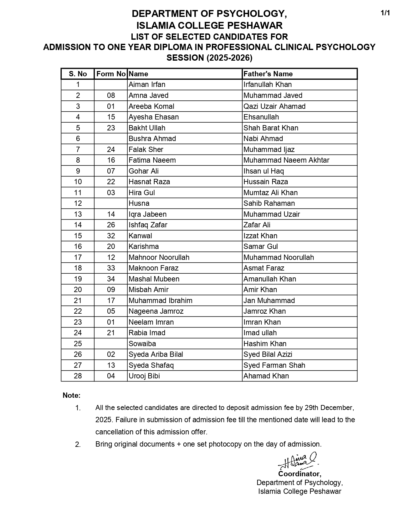 Selected Candidates for Admission to One Year Diploma in Professional Clinical Psychology