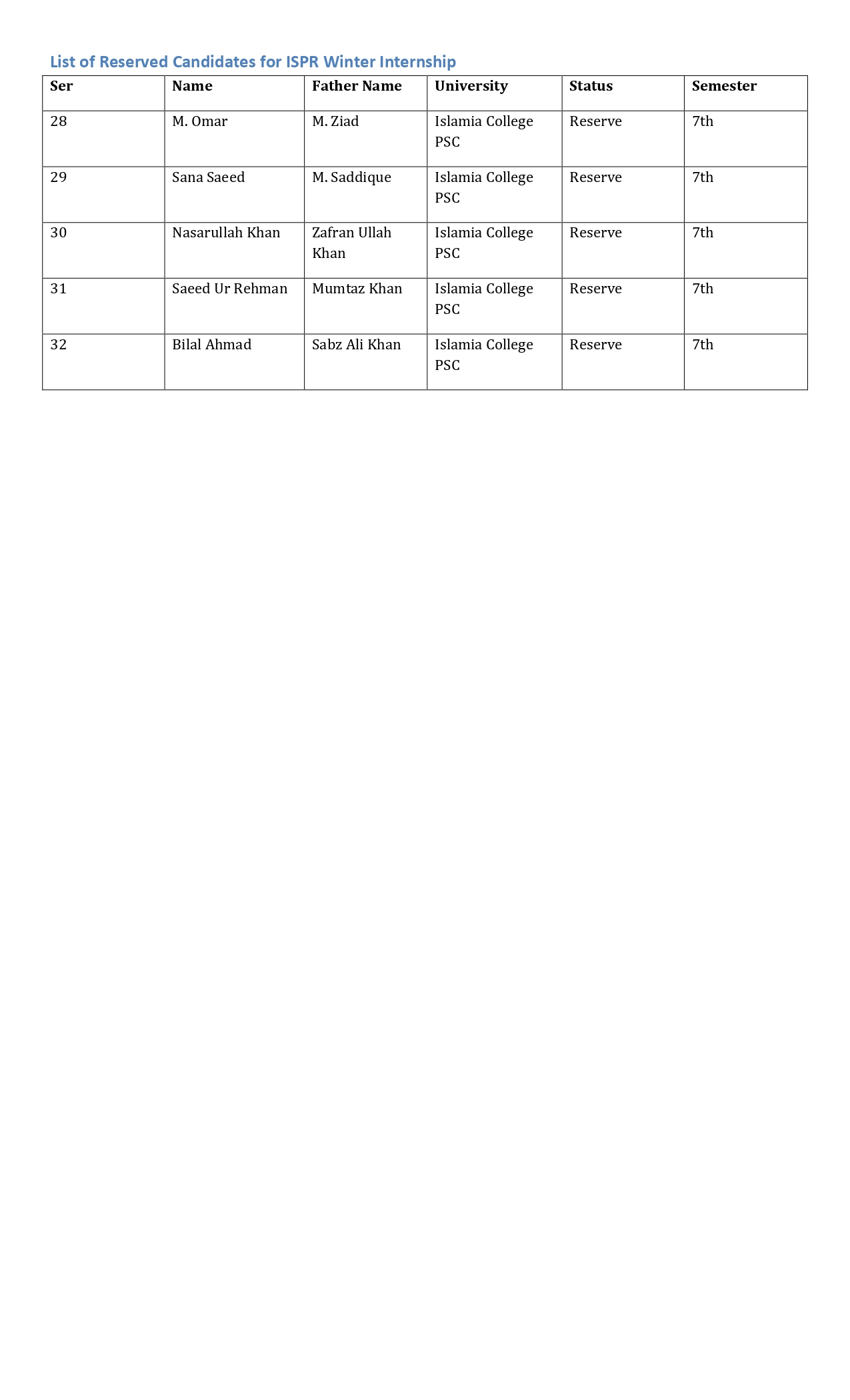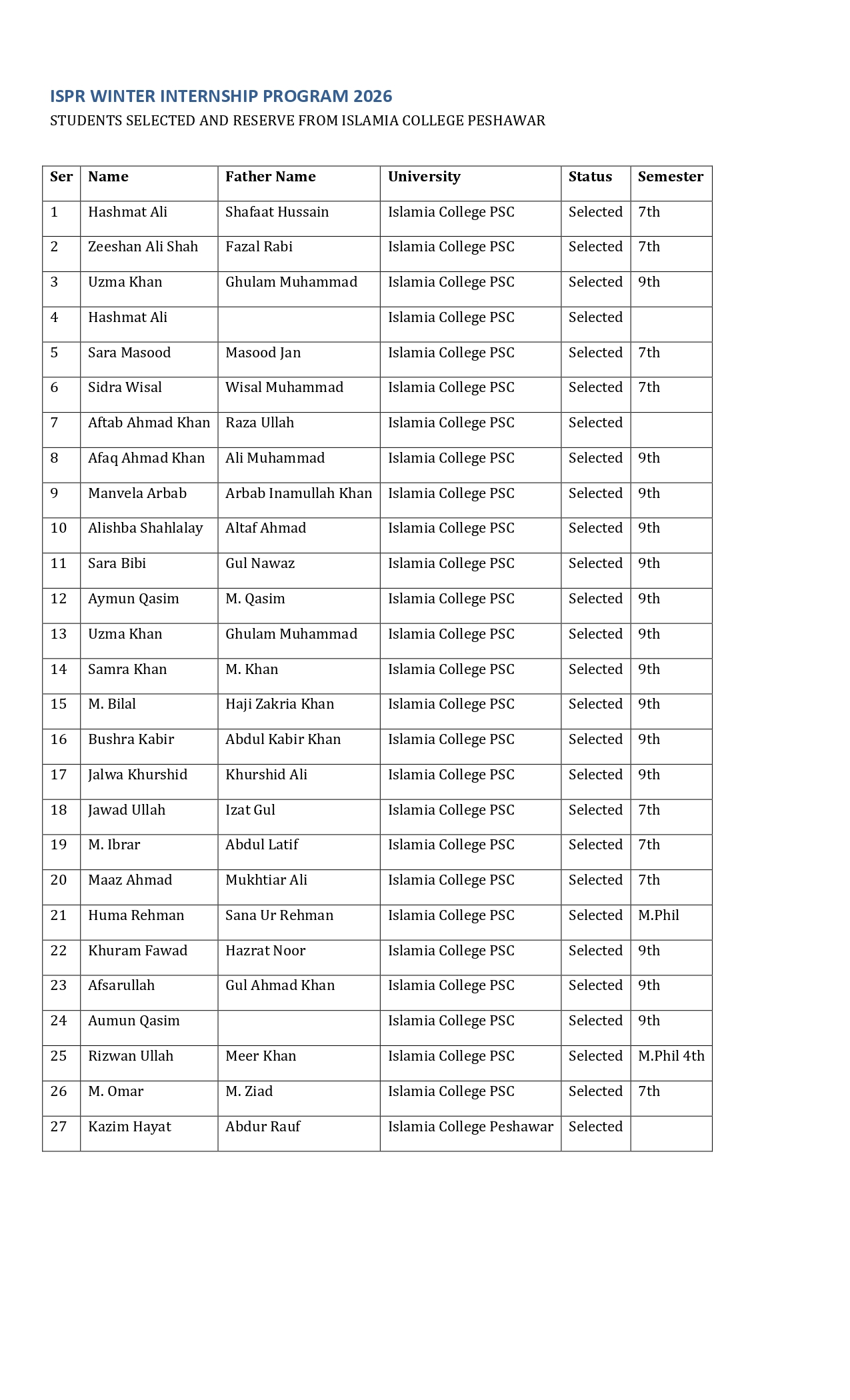 All selected and reserved students are hereby informed to report to APS Warsak (Auditorium) on 12 January at 08:00 a.m. sharp for the ISPR Winter Internship 2026